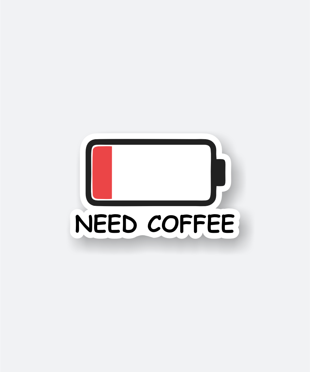 Need Coffee Sticker is perfect for coffee lovers! Featuring a low battery icon, it humorously expresses your caffeine cravings. Made with premium quality for lasting fun.
